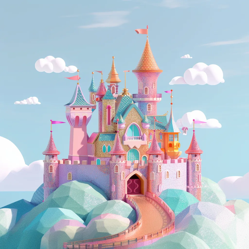 Image generated using Midjourney, using the prompt “a cartoon 3D glittery castle scene,” upgraded twice, and zoomed out at 1.5x.